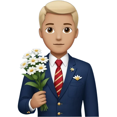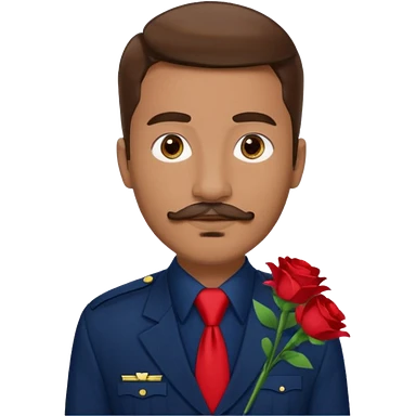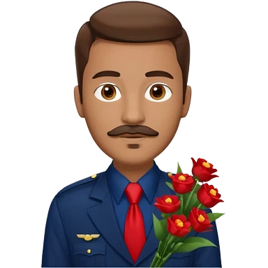 Homme avec bouquet fleurs blanches, avec uniforme bleu foncé cravate rouge, arabe raie sur le coté, brun un peu bronzé et yeux marrons 23 ans bouc moustache sans fleurs sur le costume emoji