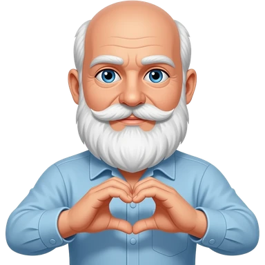 Homme barbe blanche sans cheveux, yeux bleus qui fait le signe coeur emoji