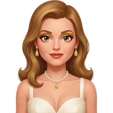 Gwendolyn Gann from James Bond Series with hazel eyes, long golden brown hair, gold eyeshadow and lipstick, ivory sweetheart dress, ivory necklace and earrings emoji