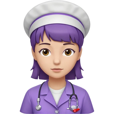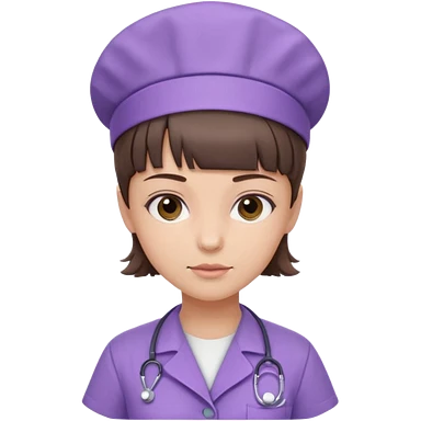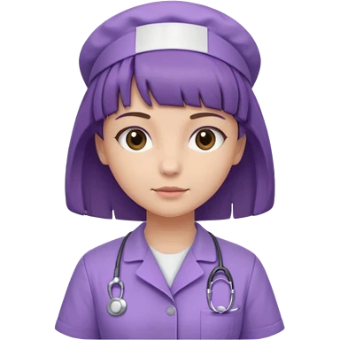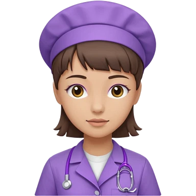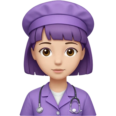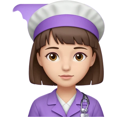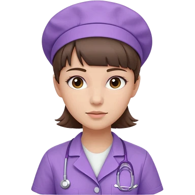 A young female slim nurse with short brown hair with fringe over her forehead, wearing larvendar purple working cloth emoji