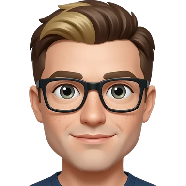 Pointy button nose, aqautic almond eyes, freckled pale skin and dark brown roots with blonde highlights and thick black frame glasses emoji