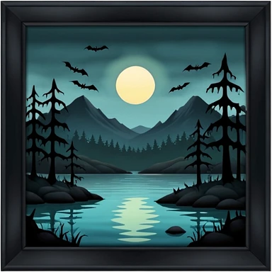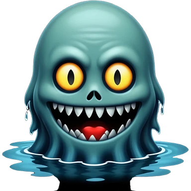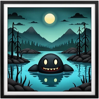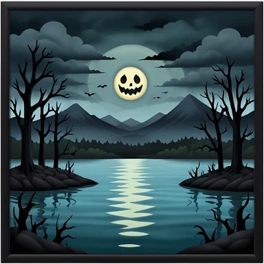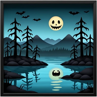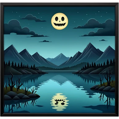 Rick Astley at a lake surrounded by a forest at nighttime with 60-65% of his face gone and the lake is behind him and the background is almost pitch black and the entire picture including Rick Astley is a staticky glitchy horror type emoji
