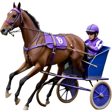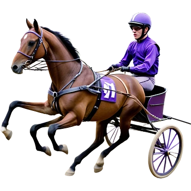 An emoji of a harness racing horse. The sulky, should be black and attached to the horse’s harness. The driver should be purple, seated in the sulky. emoji