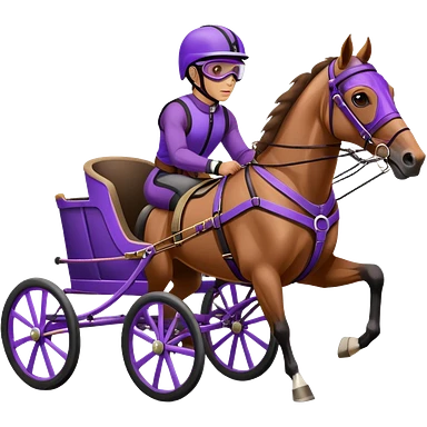 A brown harness racing horse. The sulky, a lightweight two-wheeled cart, is painted in black and attached to the horse’s harness. A driver, dressed in purple, is seated in the sulky, wearing a purple helmet with goggles. emoji