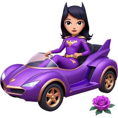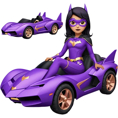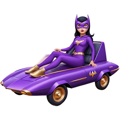 Hot full size real-appearance racing action BatGirl’s feminine midnight-purple tight outfit sixty’s tv show 1992 stealth retro cat burglar sporty petite off-road pursuit hovering hover cruiser car rose gold accents (black hair,reclined and relaxed seating position and attitude) desert emoji