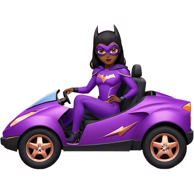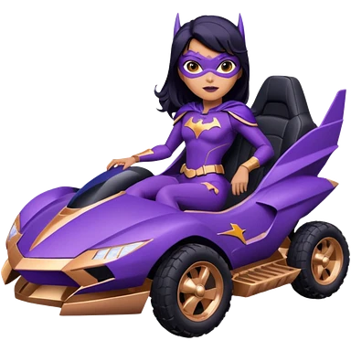 Hot full size real-appearance racing action (Darkness in her soul) BatGirl’s feminine midnight-purple tight outfit sixty’s tv show 1992 stealth retro cat burglar sporty petite off-road pursuit mobile cruiser car rose gold accents (black hair,reclined and relaxed seating position and attitude) desert emoji
