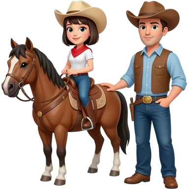 a cowgirl whose hair is a bob. she's on a horse with her tall handsome cowboy standing next to her emoji