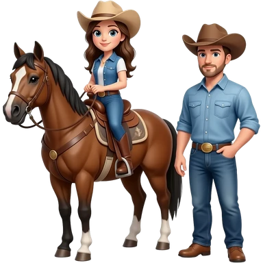 a cowgirl on a horse with her tall handsome cowboy standing next to her emoji