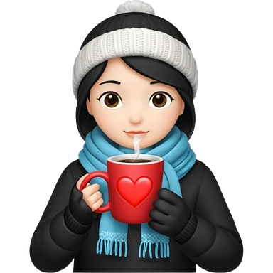cutest black heart with a winter scarf and a hot drink in hand emoji