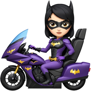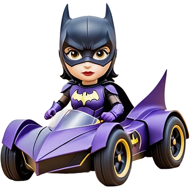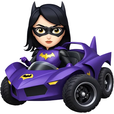 Hot full size real size -appearance electric racing action BatGirl’s feminine midnight-colored tight outfit sixty’s tv show 1992 dark stealthy sporty safe plush petite off-road pursuit cruiser car rose gold accents (black hair,reclined and relaxed torso and shoulders seating position) go kart emoji