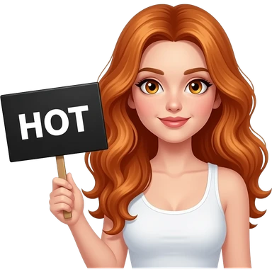 sexy girl with long wavy ginger hair and ginger eyes wearing a white tanktop is holding a black colored sign with HOT written on it emoji