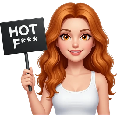 sexy girl with long wavy ginger hair and ginger eyes wearing a white tanktop is holding a black colored sign with HOT as F*** written on it emoji
