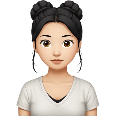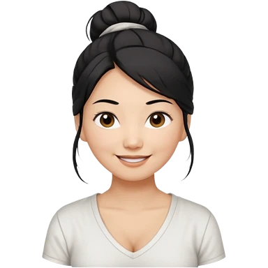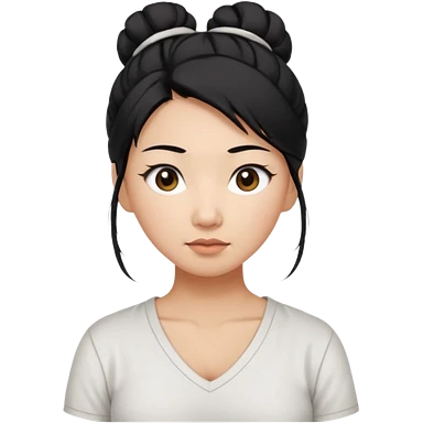 asian mom with long black hair tied in up in a messy bun and big brown eyes emoji in a white v neck shirt emoji