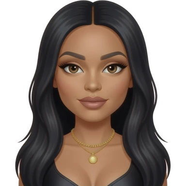 Nicki Minaj with dark brown eyes, long black hair with pink highlights, hot pink metallic sweetheart dress, silver necklace emoji