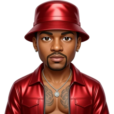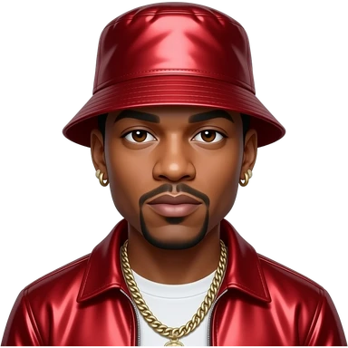 LL Cool J with dark brown eyes, red metallic bucket hat, red metallic hip-hop outfit, necklace and earrings emoji