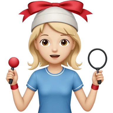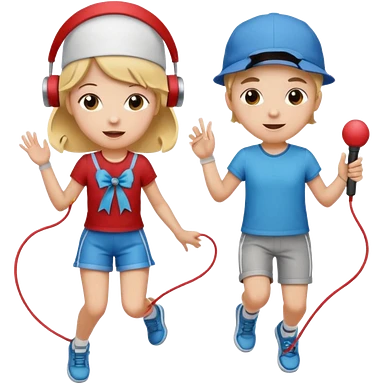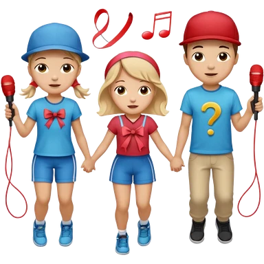 Show three big emojis: 👧🏻🎀 (the doll singing), 😀👕4️⃣5️⃣6️⃣🤾 (a player jumping rope), 👦🏻🧢 (child figure). emoji