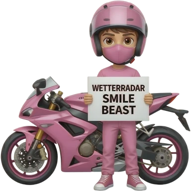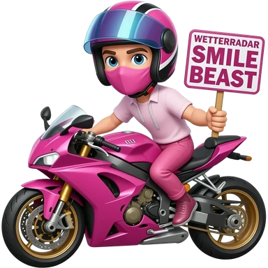 sexy boy with a motorcycle helmet in pink clothes and a pink motorcycle wearing a pink mask holding a WETTERRADAR SMILE BEAST sign emoji