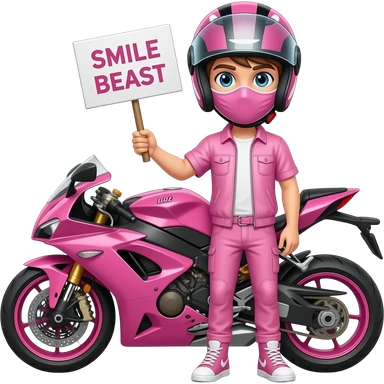 sexy boy with a motorcycle helmet in pink clothes and a pink motorcycle wearing a pink mask holding a SMILE BEAST sign emoji