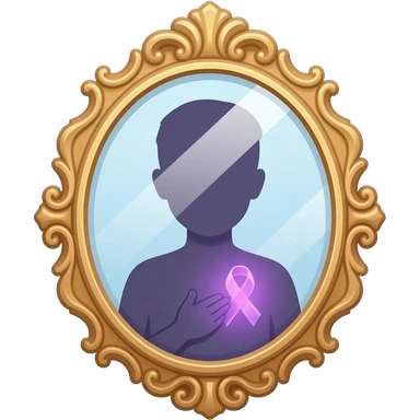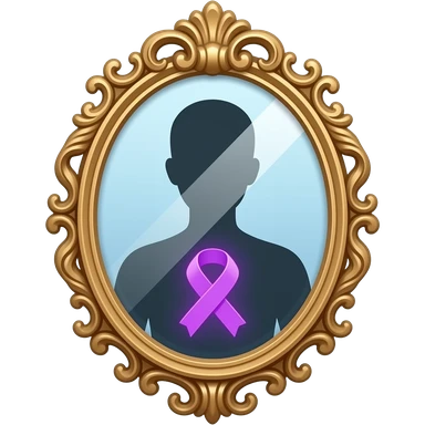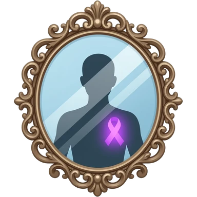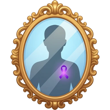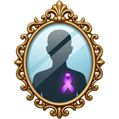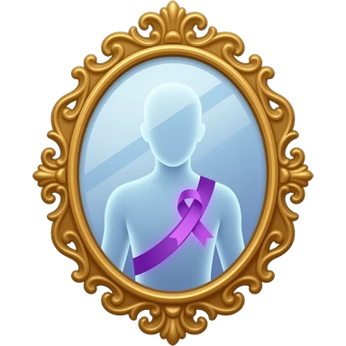 detailed and ornate mirror who reflecting a human silhouette with a glowing purple ribbon on the chest, symbolizing fibromyalgia awareness, soft gradients, subtle sparkle highlights, cute and minimal, transparent background emoji