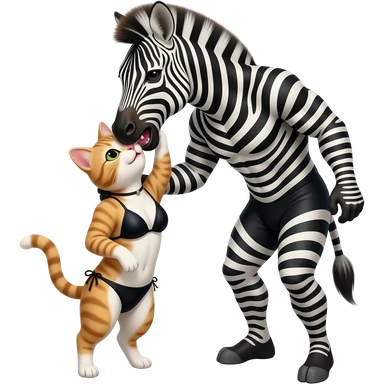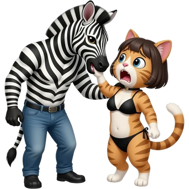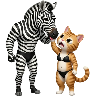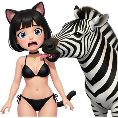 human zebra male biting the cat human chest. a human girl cat wearing black bikini and a short hair. make the cat scared emoji | AI Emoji Generator