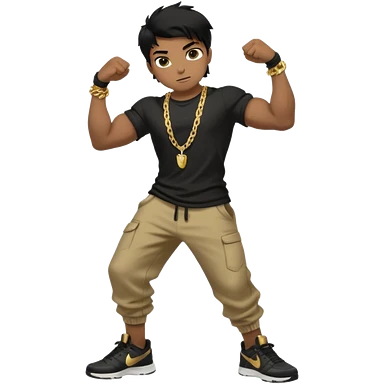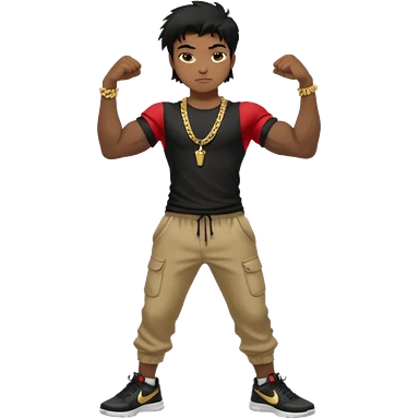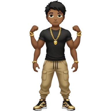 full body view of muscular teen boy with veiny hands arms and biceps. has messy black hair with dark-tan skintone with black tshirt. has gold chain and nike shoes with baggy pants emoji