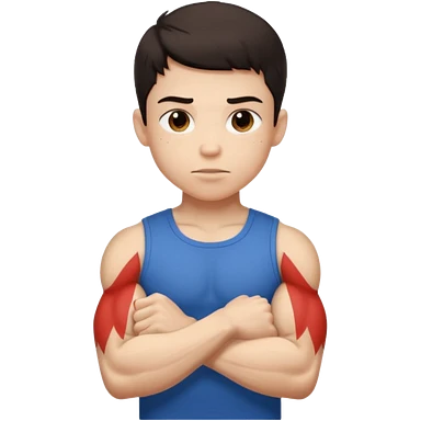 muscular teen boy with veiny hands arms and biceps. has messy brunette curly hair with tan skintone with black tshirt emoji