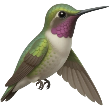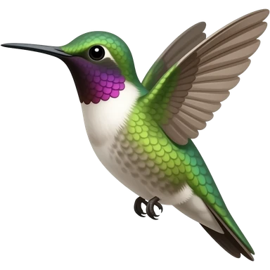 Hummingbird hovering in flight, facing to the right, mostly violet, purple and green in color emoji