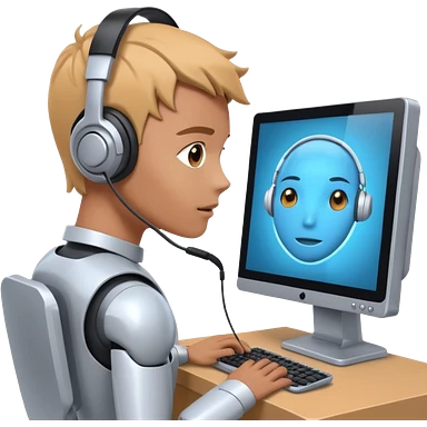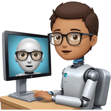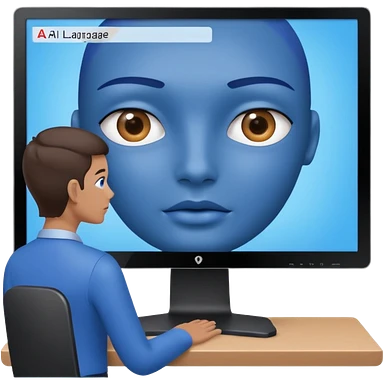 human is using some complicated system, in front of the monitor, asking someting to the monitor by natural language the monitor, ai robot answering in his own language emoji