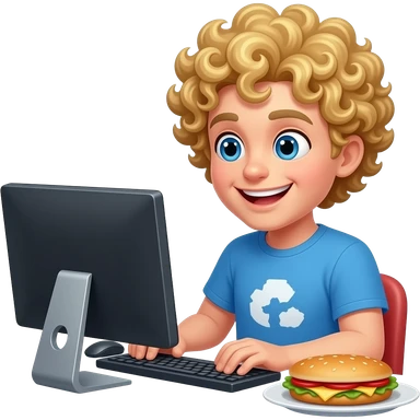 hungry software developer, somehow happy, blonde, with a pc and curly hair waiting for food emoji