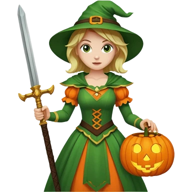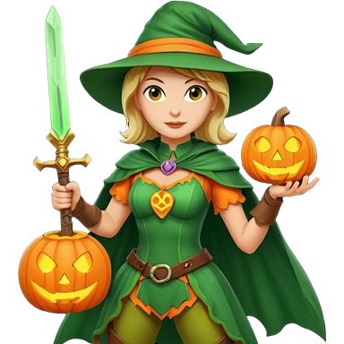 Woman Hunter With Jack o Lantern, wearing green costume, with sword emoji