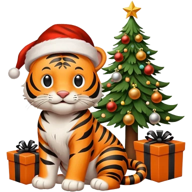 Happy tiger by a Christmas tree with gifts wearing a Santa hat in a decorated room emoji