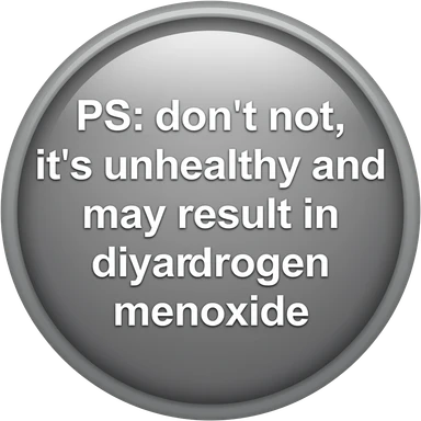 button with text reading "PS: don't not, it's unhealthy and may result in dihydrogen monoxide" emoji