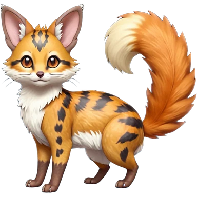Hyper realistic ember-rust copper fur molten with glowing magma seams and smoky tips beautiful elegant pretty precious cute Fakémon-Pokémon-opossum-feline-serval-caracal-chinchilla-Furret-Minccino-hybrid-creature with a big fluffy bushy tail (full body) emoji