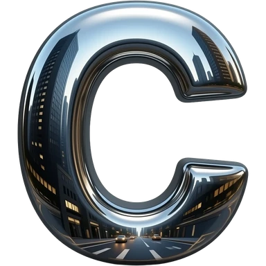 A hyper-realistic letter 'C' made of flowing, high-polish liquid chrome. Distorted reflections of a dark urban cityscape, sharp contrast, 8k resolution, 'Terminator' style aesthetic, clean and aggressive emoji