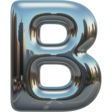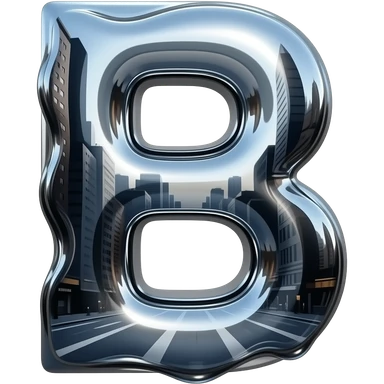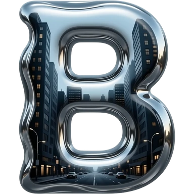 A hyper-realistic letter 'B' made of flowing, high-polish liquid chrome. Distorted reflections of a dark urban cityscape, sharp contrast, 8k resolution, 'Terminator' style aesthetic, clean and aggressive emoji