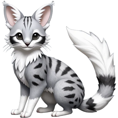 Hyper realistic ashen smoke-grey fur fading into ghost-white frost at the edges beautiful elegant pretty precious cute Fakémon-Pokémon-opossum-feline-serval-caracal-chinchilla-Furret-Minccino-hybrid-creature with a big fluffy bushy tail (full body) emoji
