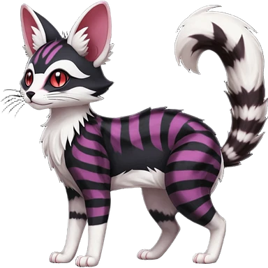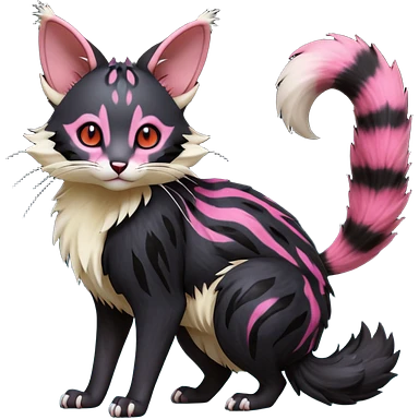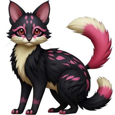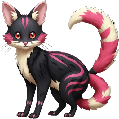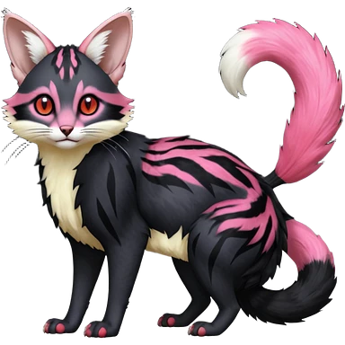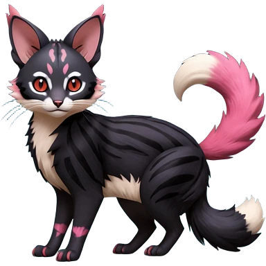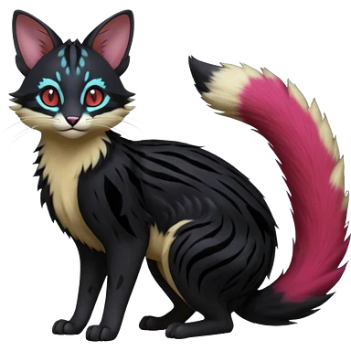 Hyper realistic void-black fur haunted by crimson neon pulse-lines like living circuitry beautiful elegant pretty precious cute Fakémon-Pokémon-opossum-feline-serval-caracal-chinchilla-Furret-Minccino-hybrid-creature with a big fluffy bushy tail (full body) emoji