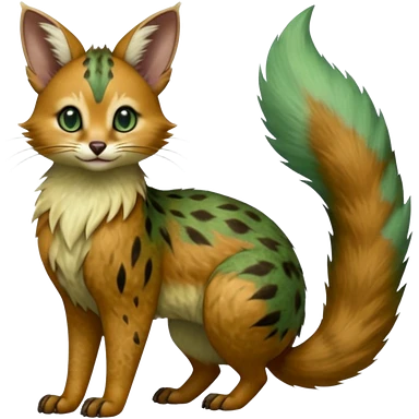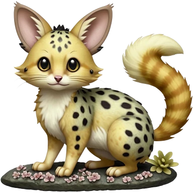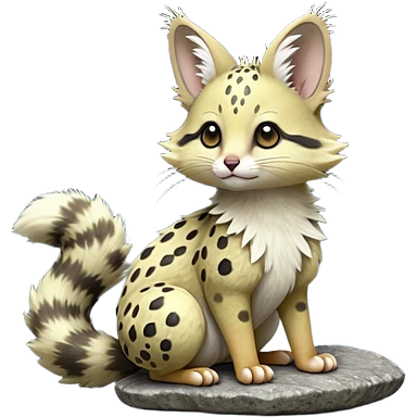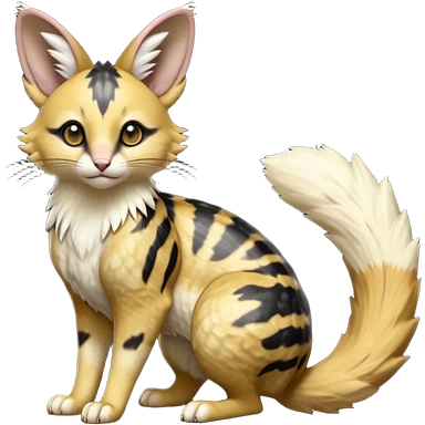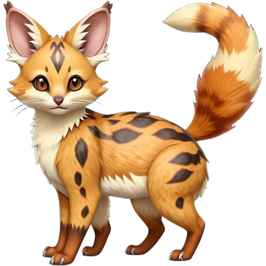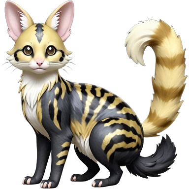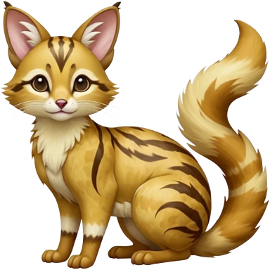 Hyper realistic honey-gold caramel fur marbled with cream-sugar ripples and satin gloss beautiful elegant pretty precious cute Fakémon-Pokémon-opossum-feline-serval-caracal-chinchilla-Furret-Minccino-hybrid-creature with a big fluffy bushy tail (full body) emoji