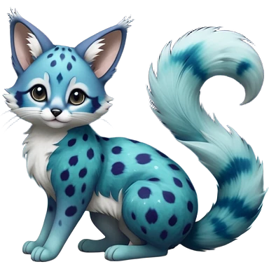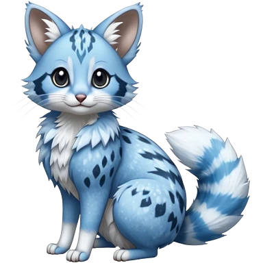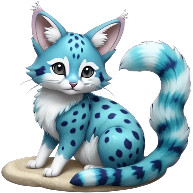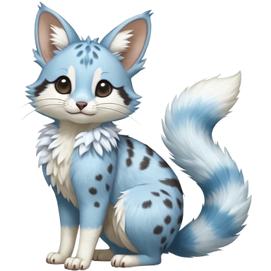 Hyper realistic soft sky-milk blue fur patched with fluffy snow-white cloud blooms beautiful elegant pretty precious cute Fakémon-Pokémon-opossum-feline-serval-caracal-chinchilla-Furret-Minccino-hybrid-creature with a big fluffy bushy tail (full body) emoji