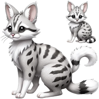 stormcell charcoal fur crackling with silver frost-veins and ghost-dust sheen Hyper-realistic beautiful elegant pretty precious cute Fakémon-Pokémon-opossum-feline-serval-caracal-chinchilla-Furret-Minccino-hybrid-creature with a big fluffy bushy tail (full body) emoji