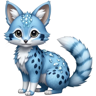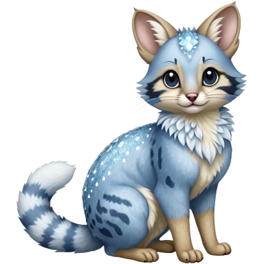 Hyper realistic glacier-blue fur edged in frost-crystal lace and diamond sparkle dust beautiful elegant pretty precious cute Fakémon-Pokémon-opossum-feline-serval-caracal-chinchilla-Furret-Minccino-hybrid-creature with a big fluffy bushy tail (full body) emoji