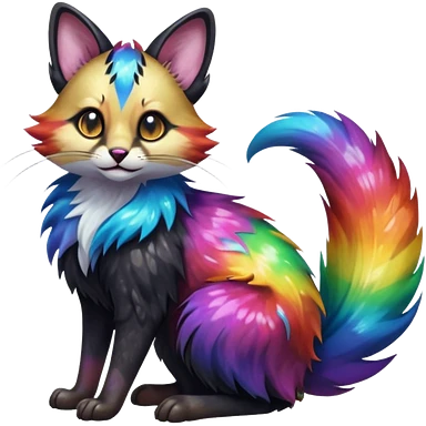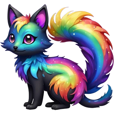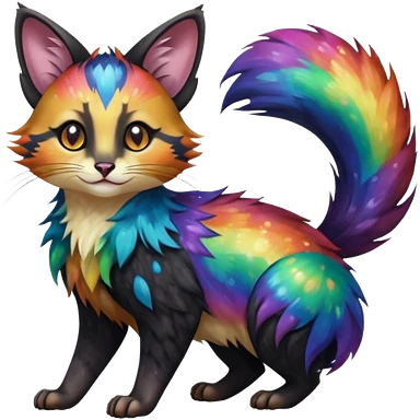 Hyper realistic tar-black fur drenched in rainbow oil slick like spilled cosmos beautiful elegant pretty precious cute Fakémon-Pokémon-opossum-feline-serval-caracal-chinchilla-Furret-Minccino-hybrid-creature with a big fluffy bushy tail (full body) emoji