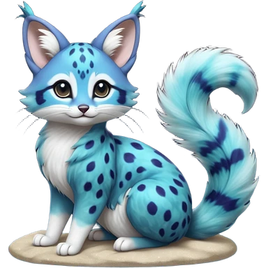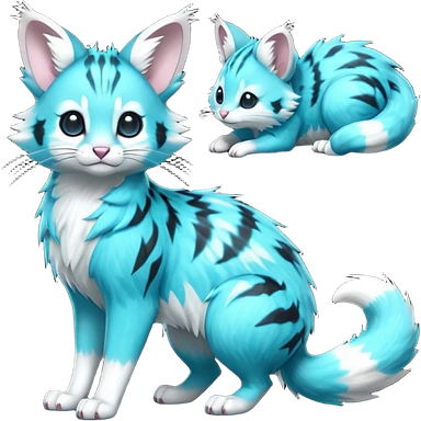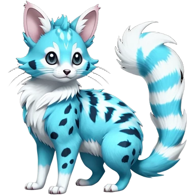 Hyper realistic neon-cyan fur streaked with lightning-white scars and glassy shine beautiful elegant pretty precious cute Fakémon-Pokémon-opossum-feline-serval-caracal-chinchilla-Furret-Minccino-hybrid-creature with a big fluffy bushy tail (full body) emoji