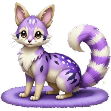 Hyper realistic midnight-violet velvet fur soaked in starlight glitter and shadow gradients beautiful elegant pretty precious cute Fakémon-Pokémon-opossum-feline-serval-caracal-chinchilla-Furret-Minccino-hybrid-creature with a big fluffy bushy tail (full body) emoji