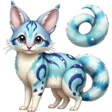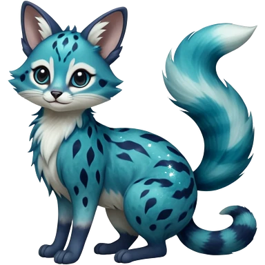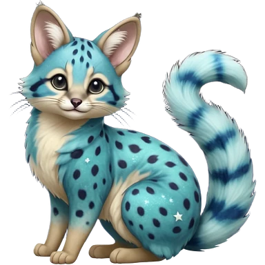 Hyper realistic galaxy-swirl indigo-teal fur scattered with star-salt sparkle grains beautiful elegant pretty precious cute Fakémon-Pokémon-opossum-feline-serval-caracal-chinchilla-Furret-Minccino-hybrid-creature with a big fluffy bushy tail (full body) emoji