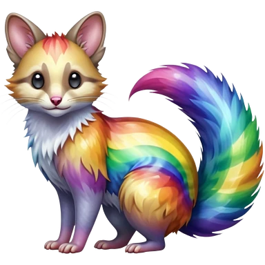 Hyper realistic prismatic glass-rainbow fur bending light into liquid shimmer waves beautiful elegant pretty precious cute Fakémon-Pokémon-opossum-feline-serval-caracal-chinchilla-Furret-Minccino-hybrid-creature with a big fluffy bushy tail (full body) emoji