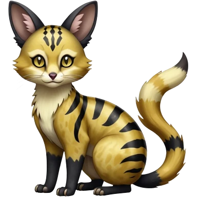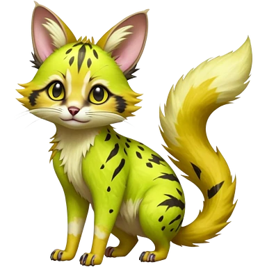Hyper realistic toxic citrus chartreuse fur splashed in acid-yellow graffiti streaks beautiful elegant pretty precious cute Fakémon-Pokémon-opossum-feline-serval-caracal-chinchilla-Furret-Minccino-hybrid-creature with a big fluffy bushy tail (full body) emoji