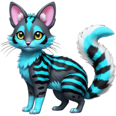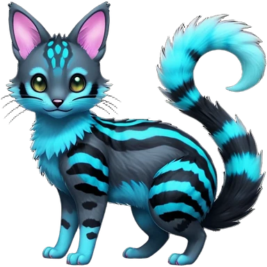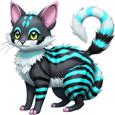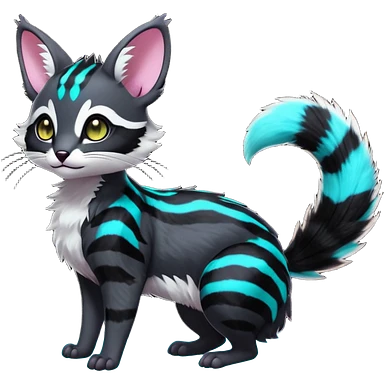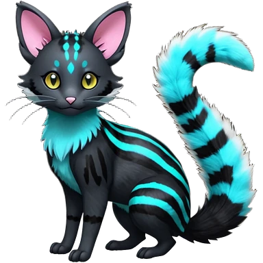 Hyper-realistic Black-coated with glowing random cyan and magenta markings divine beautiful elegant pretty precious cute young youthful Fakémon-Pokémon-alien-opossum-feline-serval-caracal-chinchilla-Minccino-hybrid-creature with a big fluffy bushy striped tail (full body)emoji
