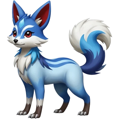 Blue, indigo, white, black Hyper-realistic Colorful Skilled Adept Graceful Asian Painted Meloetta-Furret-Lycanroc-Zangoose-fusion-hybrid-creature (full body) emoji