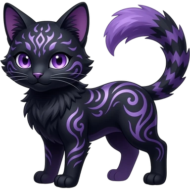 Kawaii dark black purplish blackish edgy fantasy ethereal feline-vernid-sergal-fursona animal creature with a tufted tail full body with intricate markings emoji